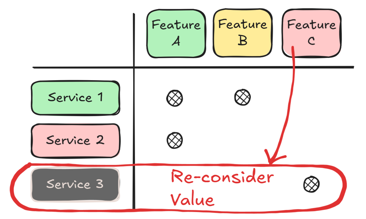 - Build a matrix with all services as rows and product features as columns.